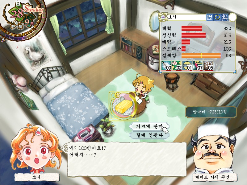 게다가 케이크 가게에 '황금의 파티시'라는 아이템이 추가되는데, 단 돈 5500원에 스트레스를 30이나 깎아주고 체중은 0.1밖에 증가 안 시키는 꿀같은 아이템입니다