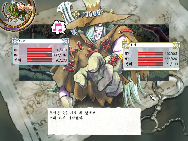 '음악' 스킬을 사용하면 적의 전의가 20씩 내려갑니다(10레벨 기준)